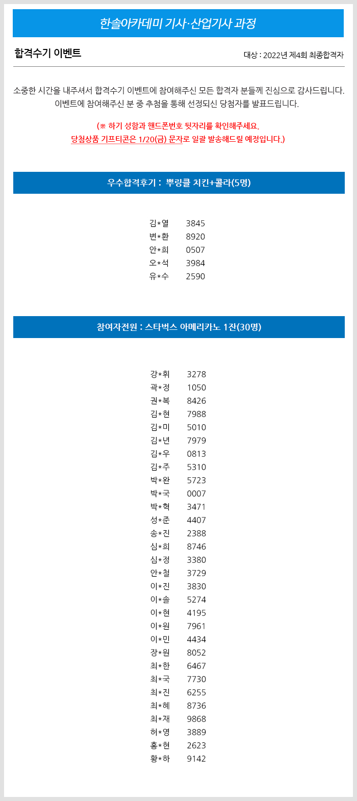 2022년 제4회 건축기사/건축설비(산업)기사 합격수기 이벤트 당첨자 발표