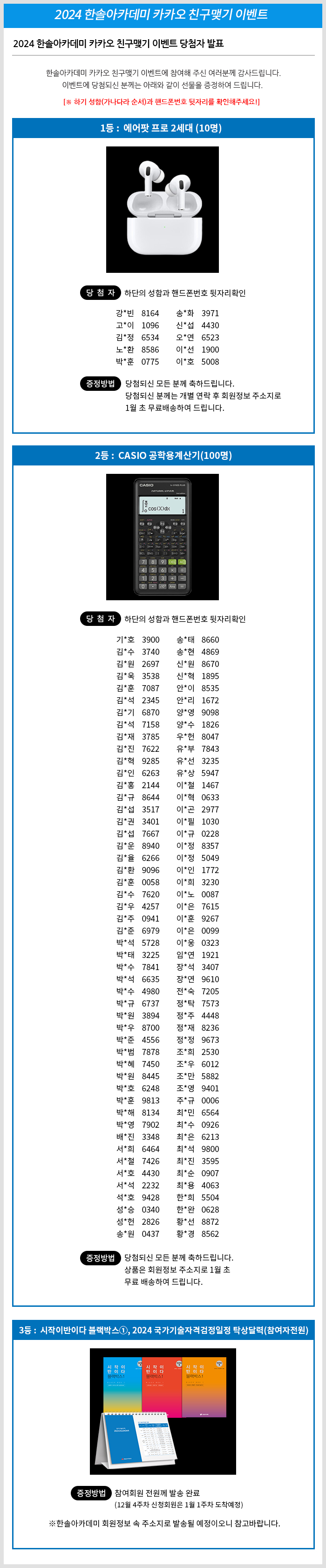 2024 한솔아카데미 카카오 친구맺기 이벤트 당첨자 발표안내